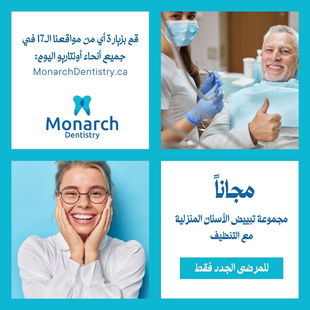 عيادة Monarch لطب الأسنان هي مجموعة طب أسنان متعددة المواقع تخدم المجتمعات في جميع أنحاء أونتاريو، وتضم 17 عيادة وفريقًا متكاملًا من أطباء الأسنان العامين والأخصائيين وأخصائي النظافة وموظفي الدعم. تعتمد العيادة على نهج يضع المريض في المقام الأول، ويجمع بين التكنولوجيا الحديثة وطب الأسنان القائم على الأدلة والخبرة السريرية المتميزة. من الفحوصات الروتينية إلى الرعاية الترميمية المعقدة، تركز عيادة Monarch طب الأسنان على صحة الفم على المدى الطويل، والراحة، والشفافية، ليشعر المرضى بالمعلومات اللازمة، والاحترام، والثقة في كل مرحلة من مراحل العلاج.